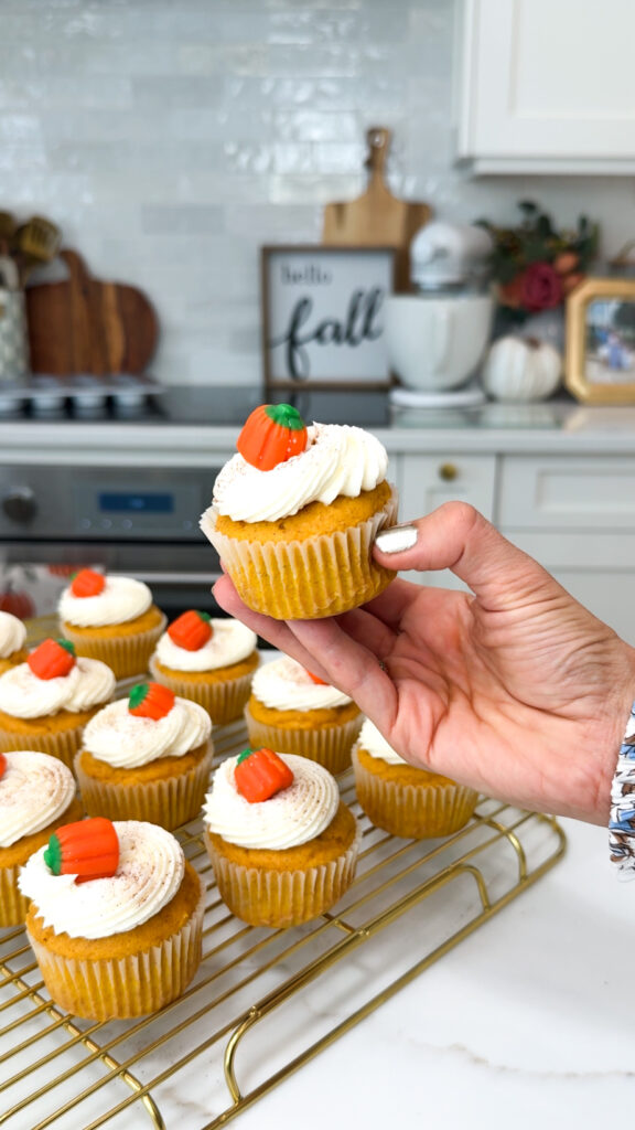 - Once cupcakes have cooled completely, pipe or spread on frosting and top with a candy pumpkin and a dash or cinnamon for garnish.